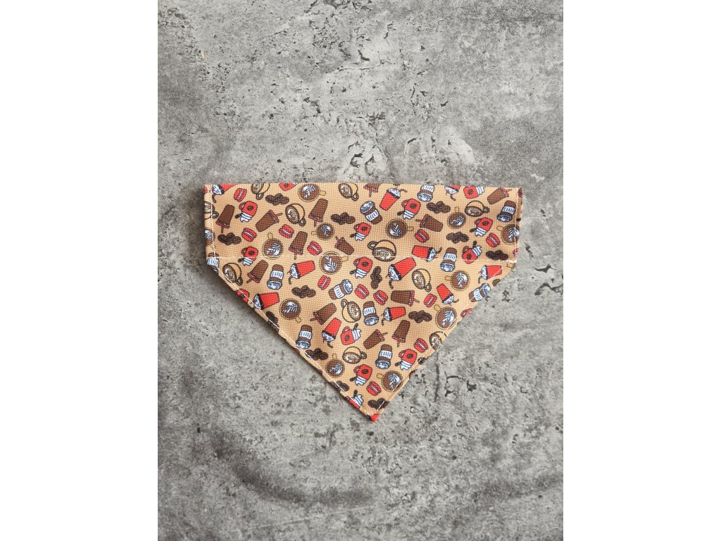 Originální šátek KÁVA je skvělým doplňkem k našemu obojku se stejným vzorem nebo k jinému, nejlépe jednobarevnému, který ho nechá vyniknout.