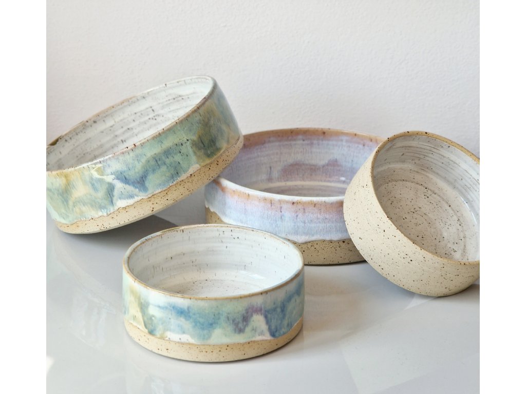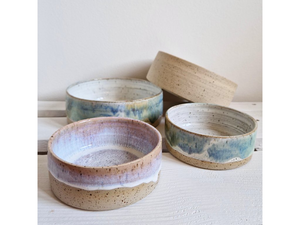 Materiál: misky jsou točené ze světlé tečkované kameniny a pálené v peci na 1220 stupňů, glazury jsou atestované na styk s potravinami