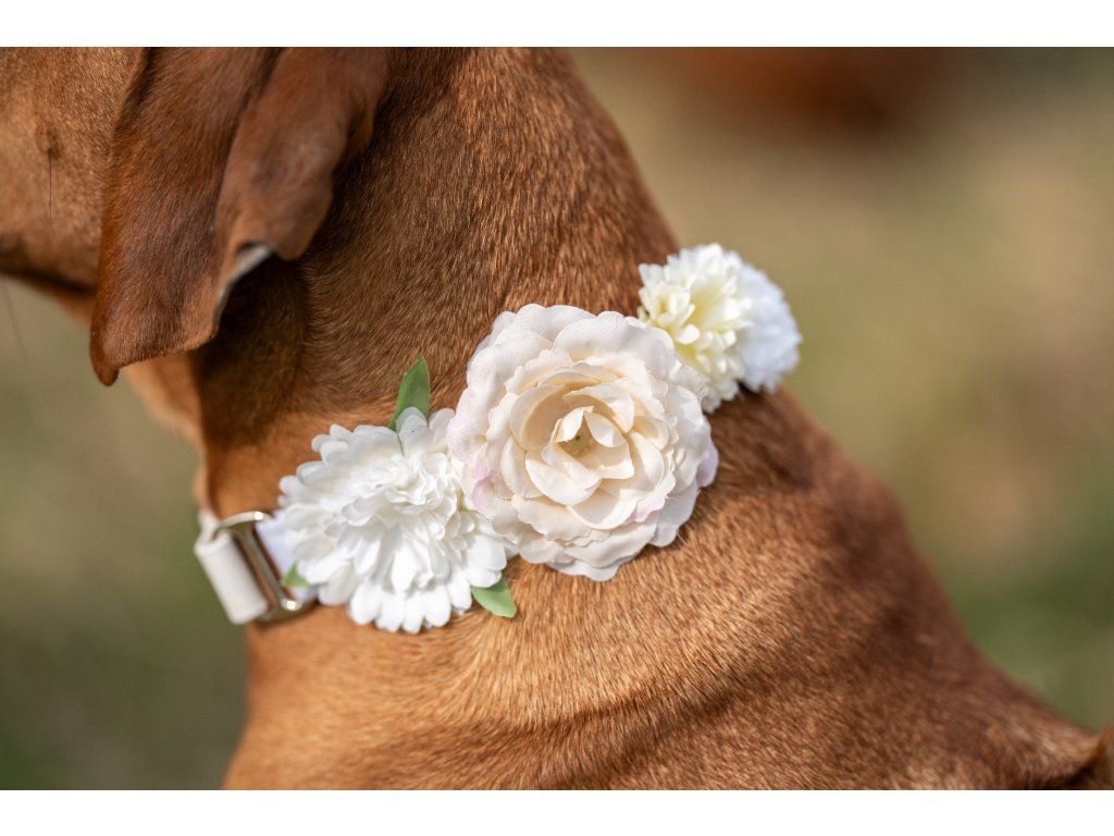 Elegantní bílý obojek s realistickými kytičkami. Aby i tvůj pejsek mohl být součástí svatebního dne.