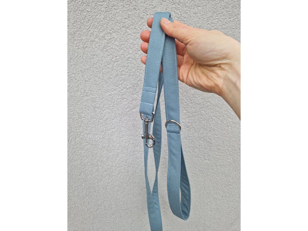- verze nastavitelné: vodítko je široké 2 cm a dlouhé celkem cca 250 cm . Vodítko je rozdělené takto: karabina-popruh 97 cm-kovový kroužek-nastavitelný popruh 150 cm celkem